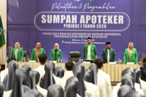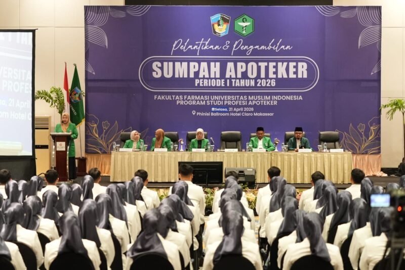 Hierarkinews, MAKASSAR – Pelantikan dan Pengambilan Sumpah Apoteker Periode 1 Tahun 2026, Fakultas Farmasi UMI Lahirkan 117 Apoteker Baru Fakultas Farmasi Universitas Muslim Indonesia (UMI) menggelar pelantikan dan pengambilan Sumpah Apoteker Periode 1 Tahun 2026 di Phinisi Ballroom Hotel Claro Makassar pada hari Selasa (21/04/2026).