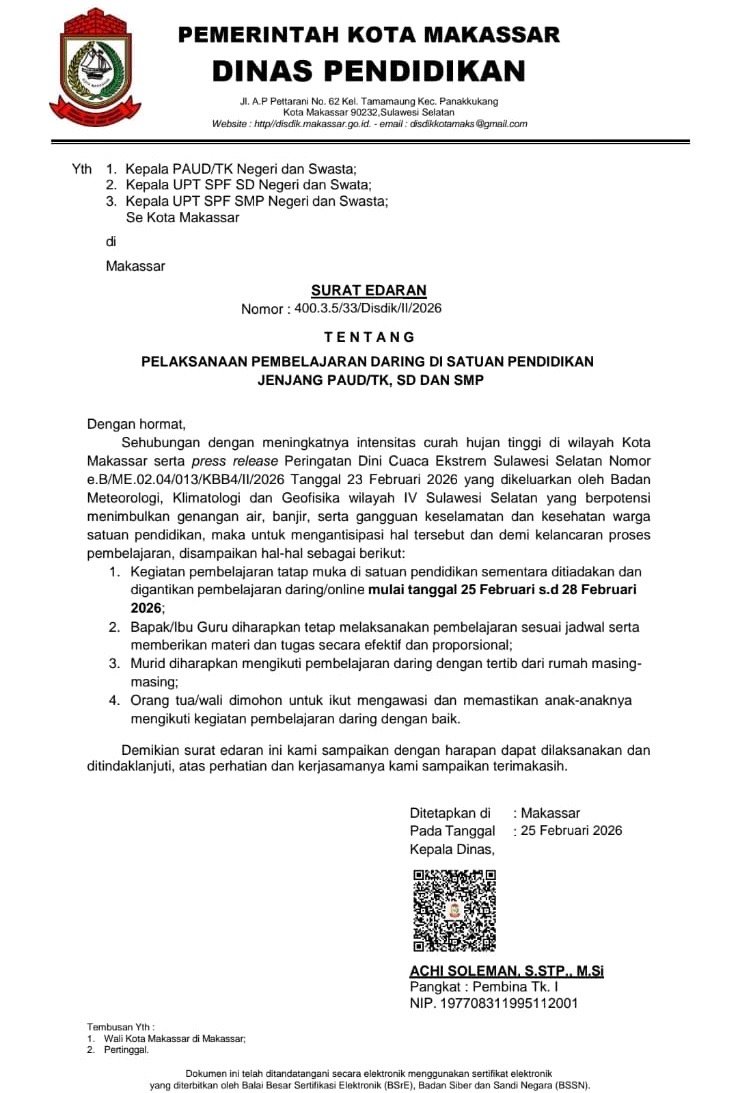 Surat Edaran bernomor 400.3.5/33/Disdik/II/2026 ditanda tangani Kepala Disdik Makassar, Achi Soleman yang diterbitkan, Rabu, (25/2/2026).