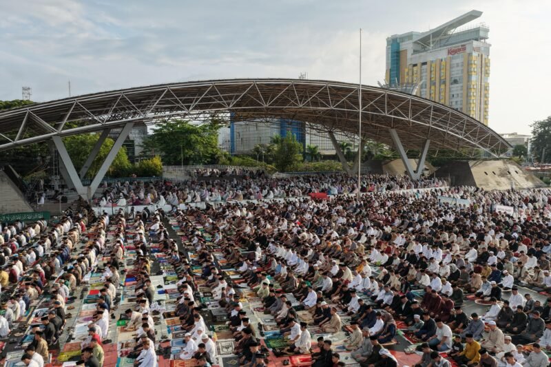 Area beton lapangan yang luas berubah menjadi lautan jemaah, menghadirkan suasana khidmat sekaligus penuh kehangatan, sebuah momen yang merefleksikan persatuan, kesederhanaan, dan kebersamaan di hari yang suci.